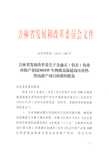 2019年11月11日,吉林省發(fā)改委發(fā)布了《關(guān)于金通靈(農(nóng)安)農(nóng)業(yè)環(huán)保產(chǎn)業(yè)園30MW生物質(zhì)高溫超高壓再熱熱電聯(lián)產(chǎn)項目申請核...