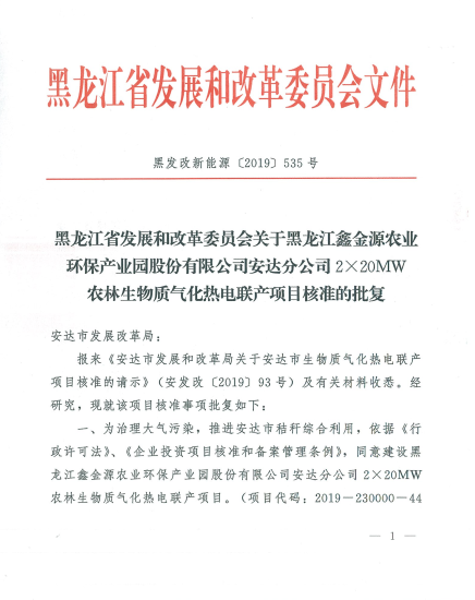 近日,黑龍江省發(fā)改委發(fā)布了《黑龍江省發(fā)展和改革委員會關(guān)于黑龍江鑫金源農(nóng)業(yè)環(huán)保產(chǎn)業(yè)園股份有限公司安達分公司2×20M...